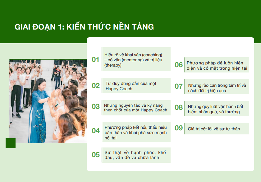Trong hành trình trở thành Người Gieo Hạnh Phúc, bạn sẽ được hướng dẫn để có được những hiểu biết đúng thông qua nội dung đào tạo: