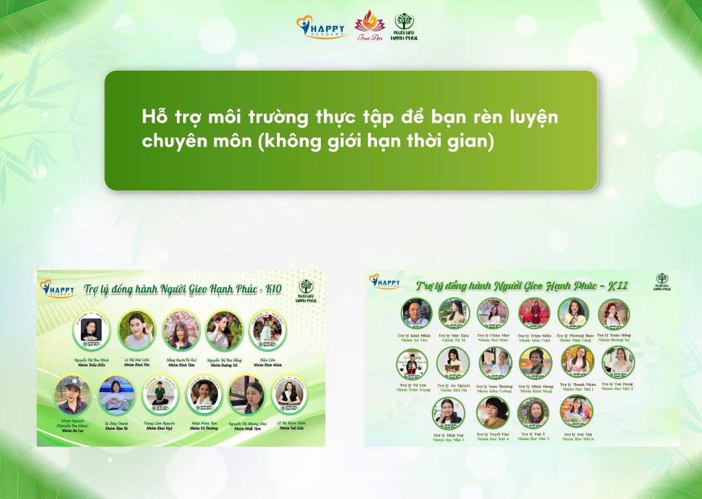 – Làm trợ lý cho các khoá học Người Gieo Hạnh Phúc