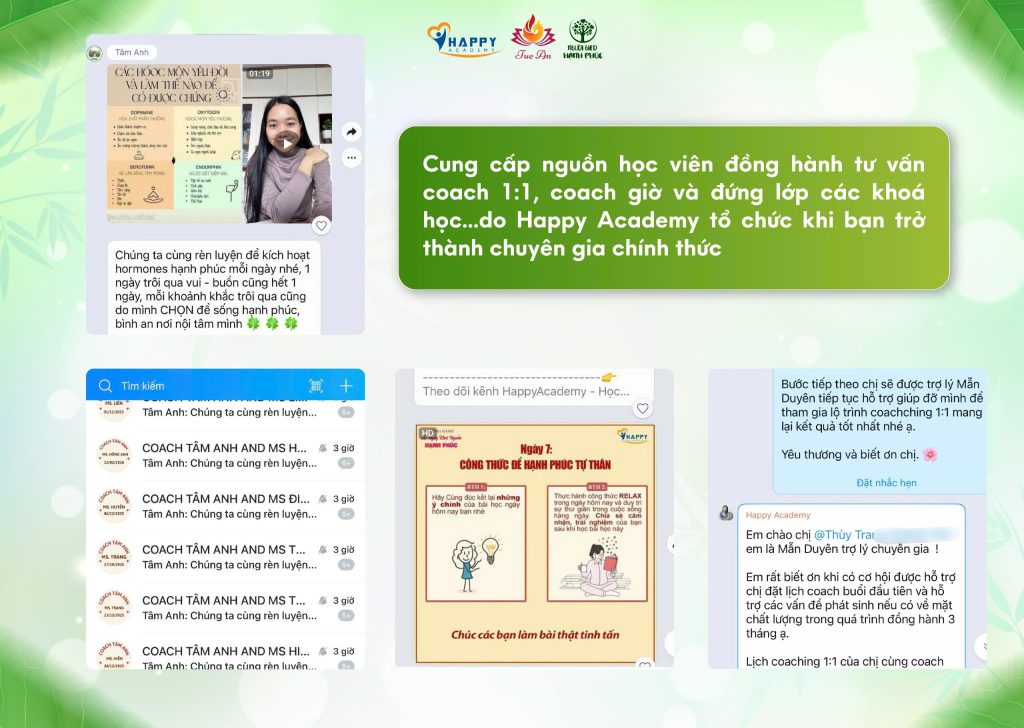 Sau khi đạt đủ năng lực và trở thành chuyên gia chính thức, bạn sẽ được kết nối nguồn học viên thực tế để: Đồng hành coach 1:1, Coach theo giờ, Tham gia đứng lớp trong các khoá học như 30 Ngày Chữa Lành Nỗi Đau, 30 Ngày Khơi Nguồn Hạnh Phúc…