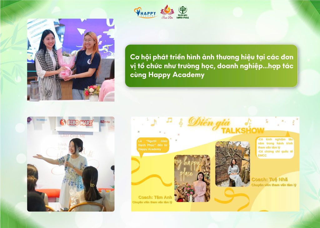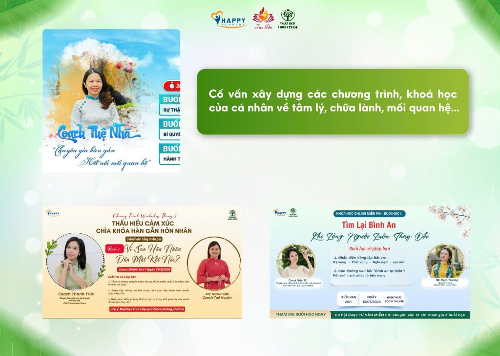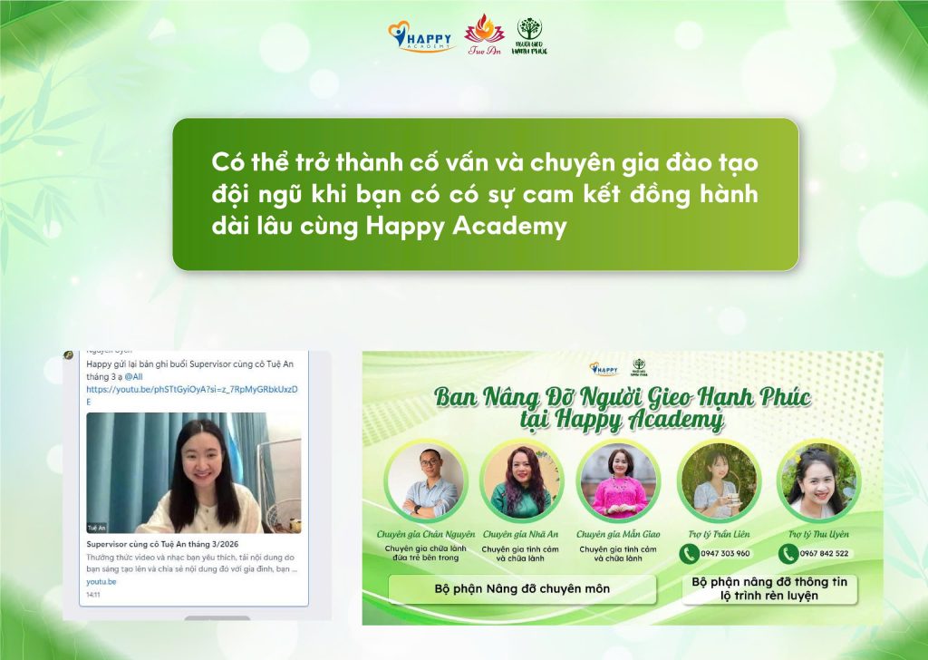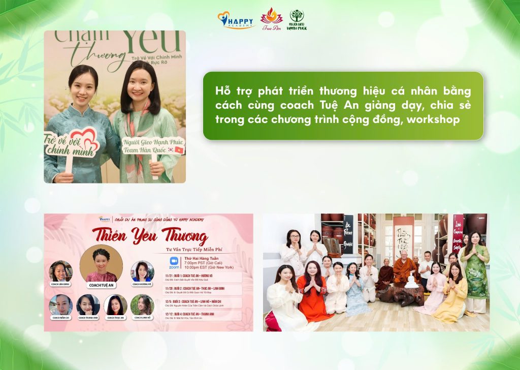 Bởi vì bạn không đi một mình. Luôn có Coach Tuệ An và đội ngũ Happy Academy ở phía sau để đồng hành, hỗ trợ và nâng đỡ bạn trên từng chặng đường.