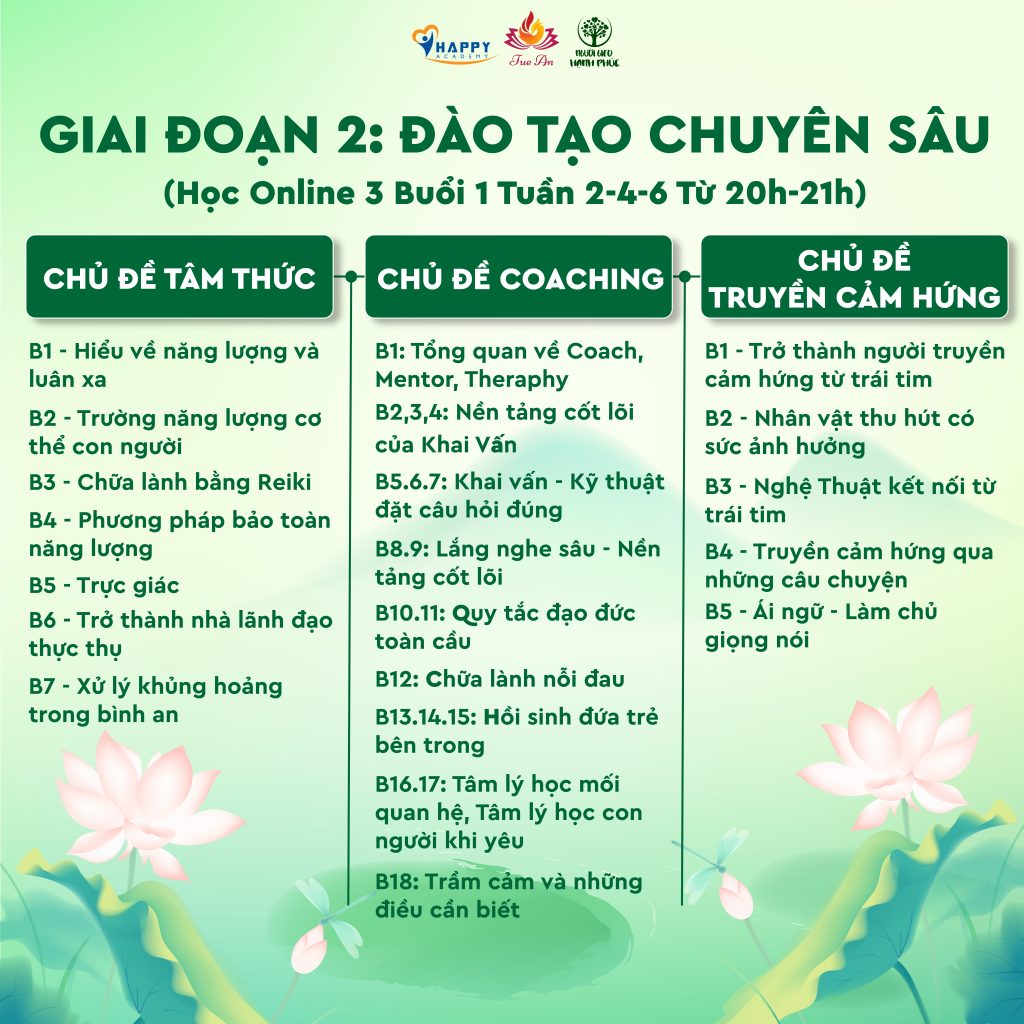 Sau khi đã có nền tảng, bạn sẽ bước vào giai đoạn phát triển năng lực chuyên môn với 3 mảng nội dung đào tạo chính bao gồm: chủ đề tâm thức, chủ đề coaching, chủ đề truyền cảm hứng