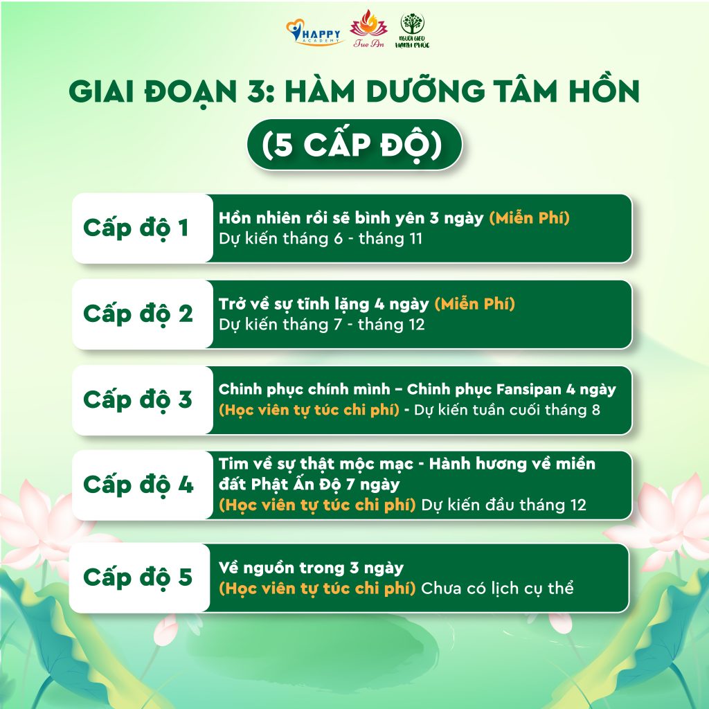 Khi tham gia Người Gieo Hạnh Phúc, bạn không chỉ học kiến thức, mà sẽ đi qua một lộ trình phát triển toàn diện gồm 4 giai đoạn:
