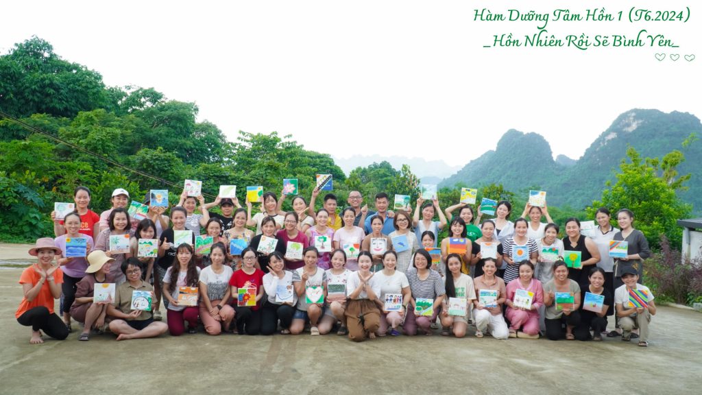 “…3 ngày trải nghiệm đúng chuẩn hồn nhiên rồi sẽ bình yên. Được chơi những trò chơi dân gian tuổi thơ, ca hát, vẽ tranh đấu giá từ thiện, diễn kịch, xem phim, thư giãn, tĩnh lặng, yoga, thiền, nấu ăn bằng bếp củi, kết nối với thiên nhiên, ngủ lều trại ngoài sân, ngủ trưa trên đồi, leo đồi, lội suối, hái bưởi, dọn dẹp, đốt lửa trại…